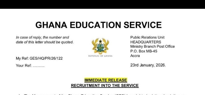 In an official statement dated 23rd January, 2026, the Management of the Ghana Education Service said its attention has been drawn to a document being circulated online and attributed to the Service. The document, which claims that recruitment has begun, has been described as false and misleading.