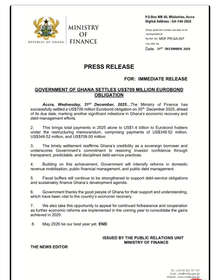 The Ministry of Finance has announced that the Government of Ghana has successfully settled a Eurobond obligation valued at 709 million United States dollars. The payment was completed on 30 December 2025, ahead of the scheduled due date, marking a notable step in the country’s ongoing economic recovery and debt management programme.