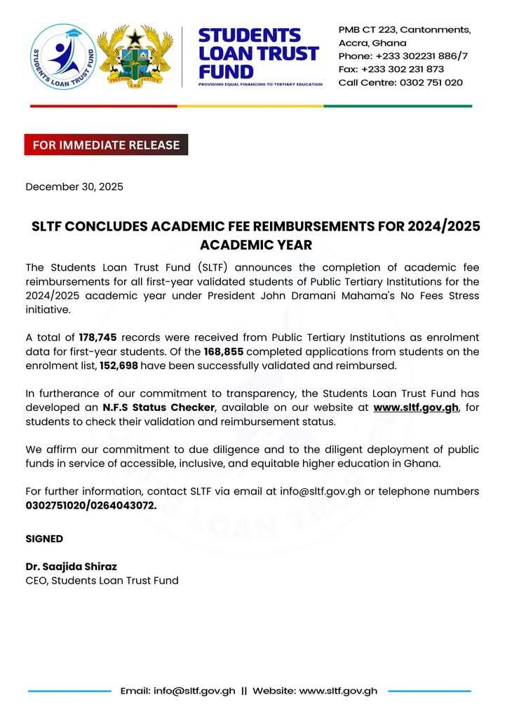 The Students Loan Trust Fund has announced the successful completion of academic fee reimbursements for first-year students enrolled in public tertiary institutions for the 2024/2025 academic year. The exercise was carried out under the government’s No Fees Stress initiative, which seeks to reduce the financial burden on students and families across Ghana.